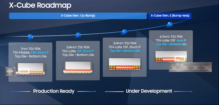 三星X-Cube 3D封装技术。 2020年8月,三星公布了其名为“eXtended-Cube”的3D封装技术,简称“X-Cube”。该技术采用TSV进行芯片间垂直互联,能大幅缩短裸芯片间的信号距离,提高数据传输速度和降低功耗。2022年10月,三星电子代工业务总裁Si-young Choi在三星晶圆代工论坛上表示,三星采用微凸块连接的X-Cube 3D封装技术将在2024年做好大规模量产的准备,无凸块的X-Cube封装技术将在2026年问世。