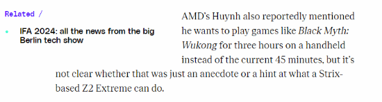据报道,AMD表示正在与多家合作伙伴合作,因此该芯片可能已被派送到各个掌机制造商手中。AMD发言人Stacy MacDiarmid表示,希望掌机上玩《黑神话》的续航可以达到3个小时,而不是目前的45分钟,目前尚不清楚其发言是否是对基于Strix的Z2 Extreme掌机表现的暗示。