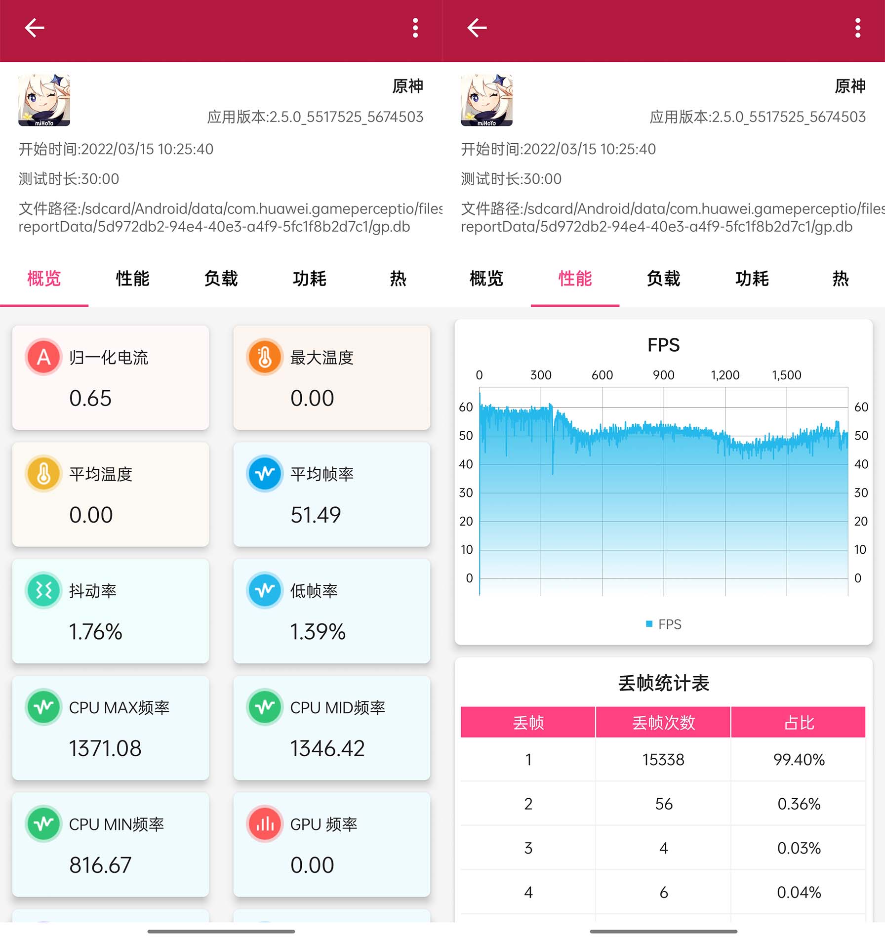 最后则是重点游戏《原神》,适当调整画面质量后,OPPO Find X5 Pro天玑版运行半小时游戏帧率表现十分不错,而且全程没有使用任何的辅助散热手段,平均帧率达到了51.49。从帧率曲线可以见到,游戏运行到一定时间后会出现一些帧数上的浮动,但考虑到《原神》对性能要求之高,个人认为天玑9000的发挥还是比较平稳的。