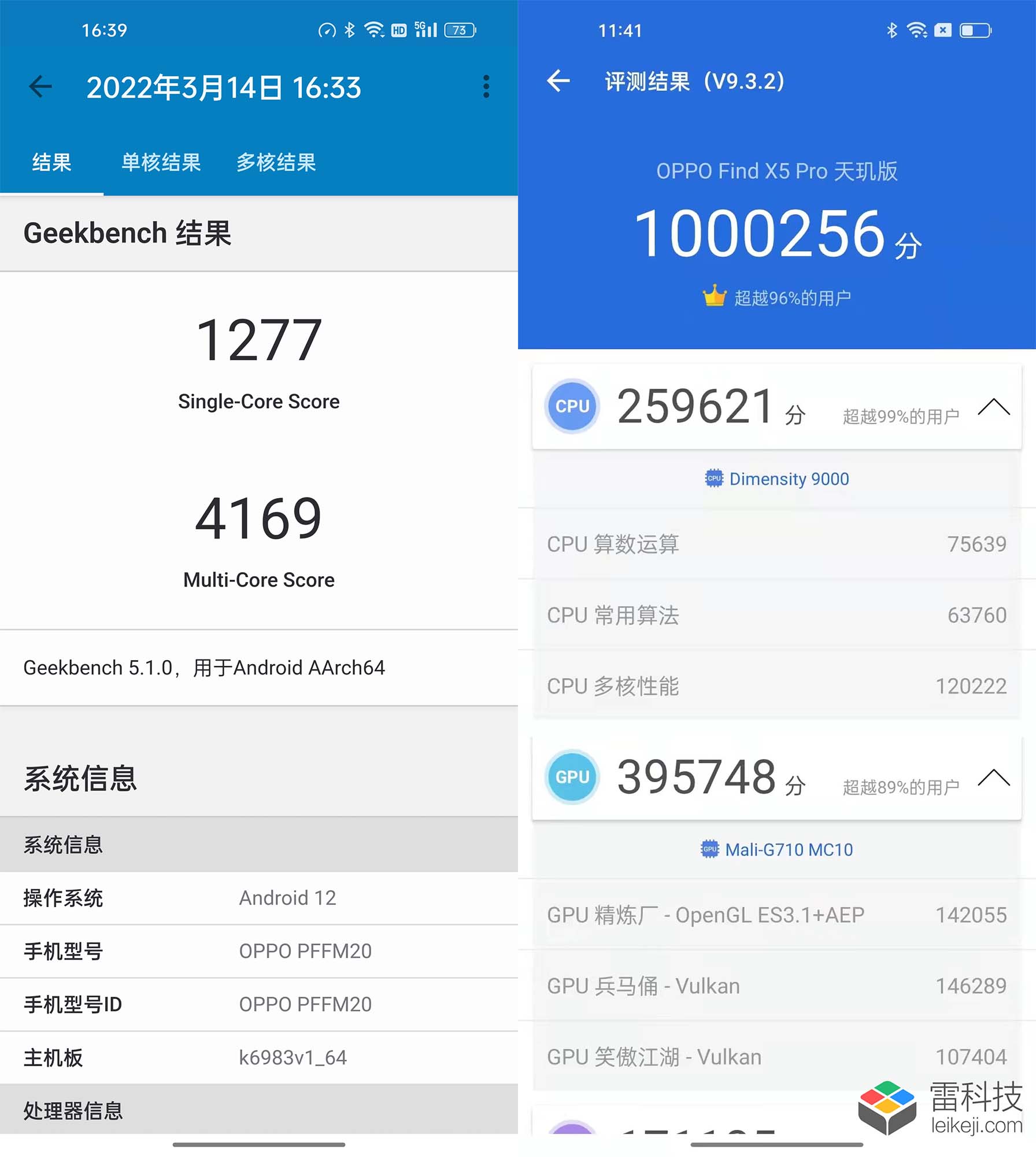 在常规的跑分测试中,小雷手上这台OPPO Find X5 Pro天玑版在安兔兔项目中的最高成绩突破了100万,具体为1000256分;而GeekBench 5这边,跑分最好的成绩达到了单核1277、多核4169分的水准,大体来说这一性能表现已经是安卓阵营中的旗舰第一梯队,给我们接下来的游戏测试增加了不少信心。