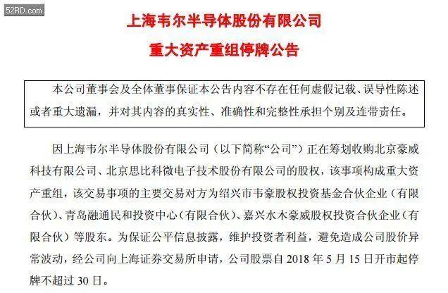 2017年6月3日,上市仅一个月的韦尔股份就迫不及待地宣布正在筹划一项重大事项,并于当年9月5日宣布已与北京豪威股东签署重大资产重组框架协议,拟收购北京豪威86.4793%的股权。三周后,这场收购计划就因遭到当时北京豪威的股东之一珠海融锋的反对而宣告终止。