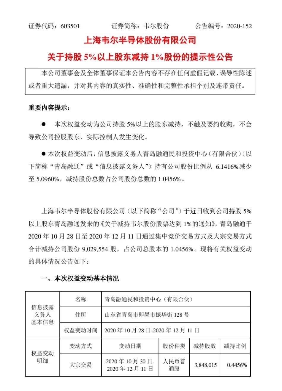 12月15日,芯片龙头韦尔股份发布公告,持股5%以上的股东青岛融通于2020年10月28日至2020年12月11日通过集中竞价交易方式及大宗交易方式合计减持公司股份9029554股,占公司总股本的1.0456%。这已是今年11月份以来,出现的第四次大规模减持。