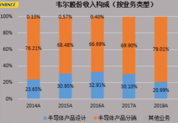 2018年,韦尔股份39.64亿元的营收中,代理销售营收贡献31.3亿元,占收入比重近80%;毛利率更高的半导体设计及销售业务,营收8.3亿元,仅占收入比重20%。
