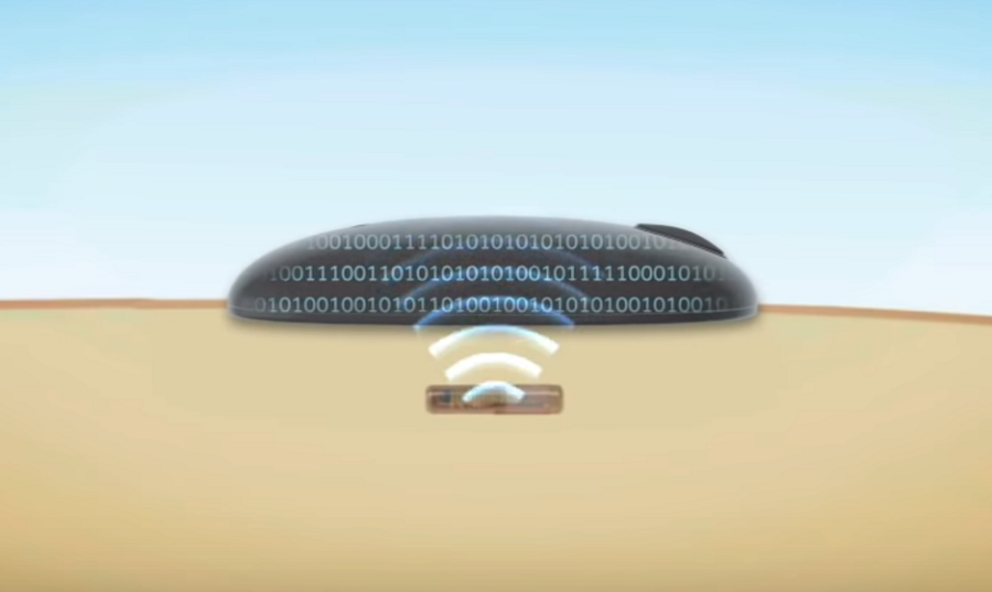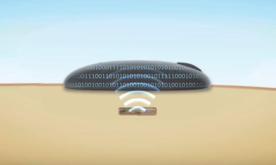 ▲皮下植入式血糖传感芯片示意图,光化学传感器将血糖信号传输至中转器,最终通过手机软件无线读取 (图片来自eversense 官方宣传片)