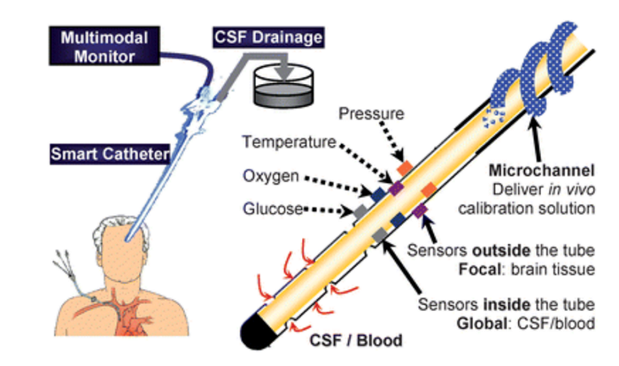 这些年,它们也在飞速发展。其中进展最快的,是脑脊液/腹水的多参数检测芯片。 这类技术主要着眼于对颅内压,颅内温度,脑脊液葡萄糖浓度,疾病标志物浓度,各类离子浓度等进行实时监测。这类技术对急性脑损伤,开颅手术患者的疗效和生命体征监测有着至关重要的意义。除此以外,由于急性感染反应起病急,预后凶险,包括作者在内的多个研究组也在着手开发能实时检测数个感染免疫指标的可植入式传感芯片。
