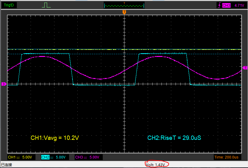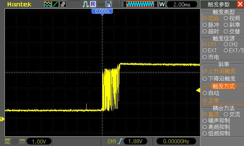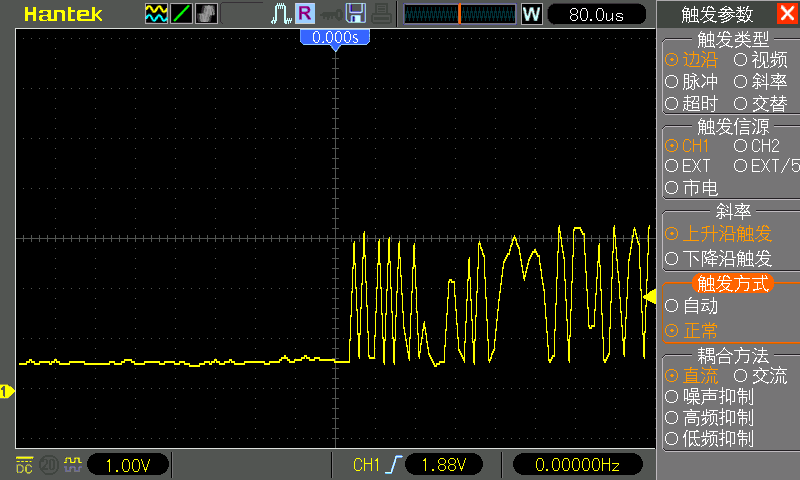 可以看到 LED 由亮到灭时波形有很多毛刺(或者振荡)。