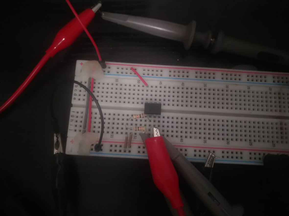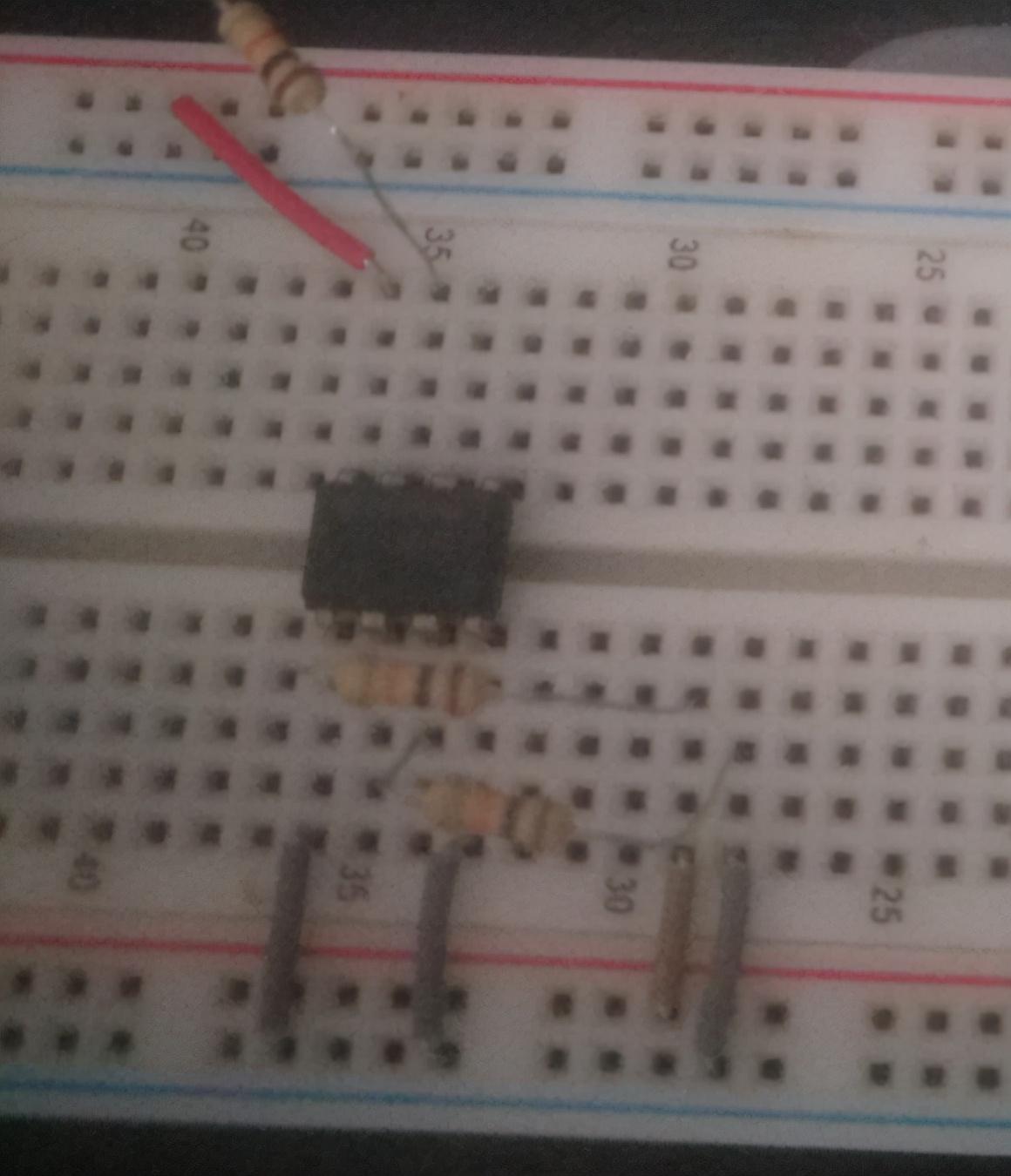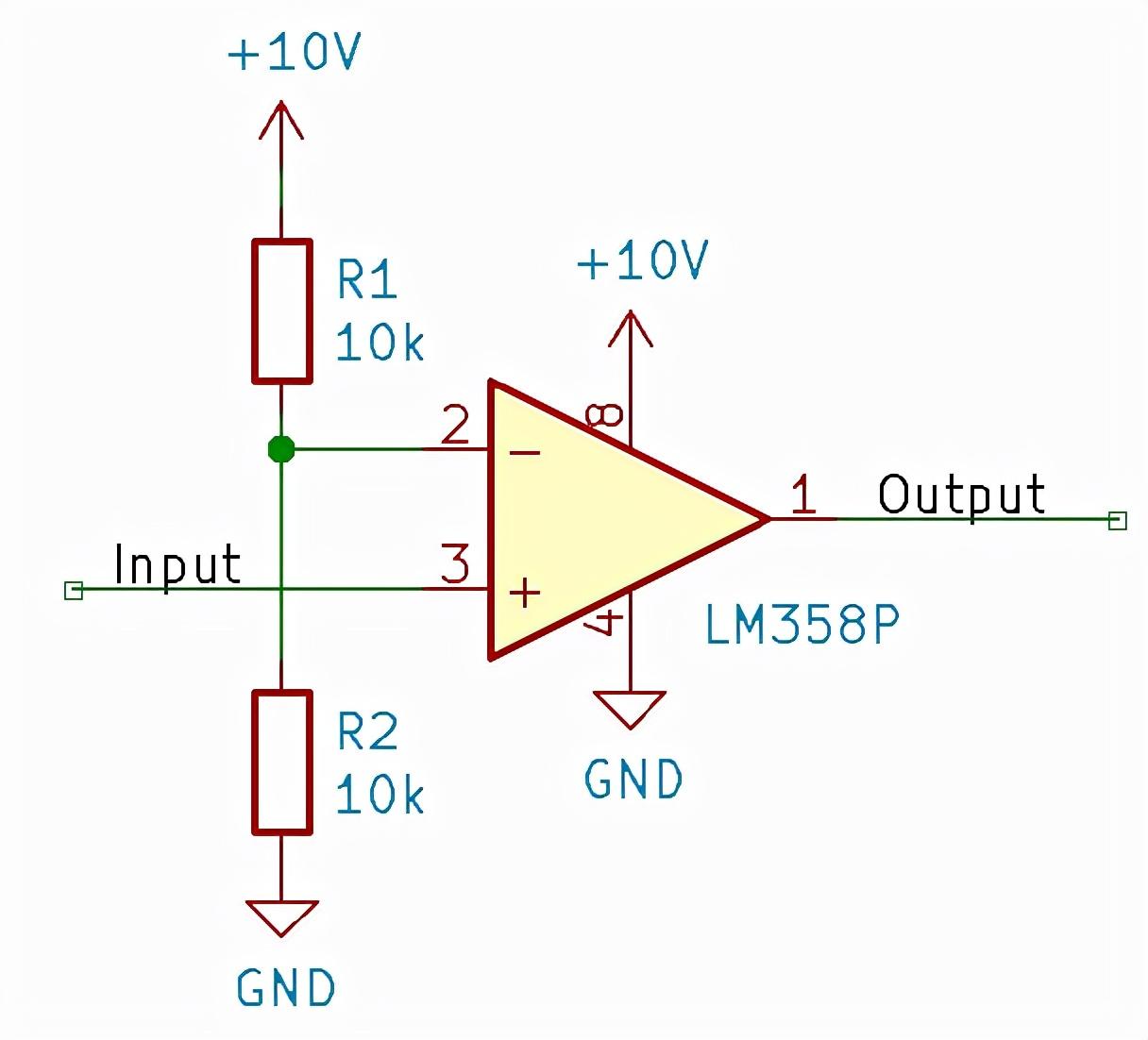 两个10k 电阻构成分压器接到反相输入引脚,提供一个比较参考电压 5 伏。正弦信号输入到同相引脚。同相输入引脚我们输入一个以 5 伏为中心的正弦波,这会在输出引脚输出一个方波。