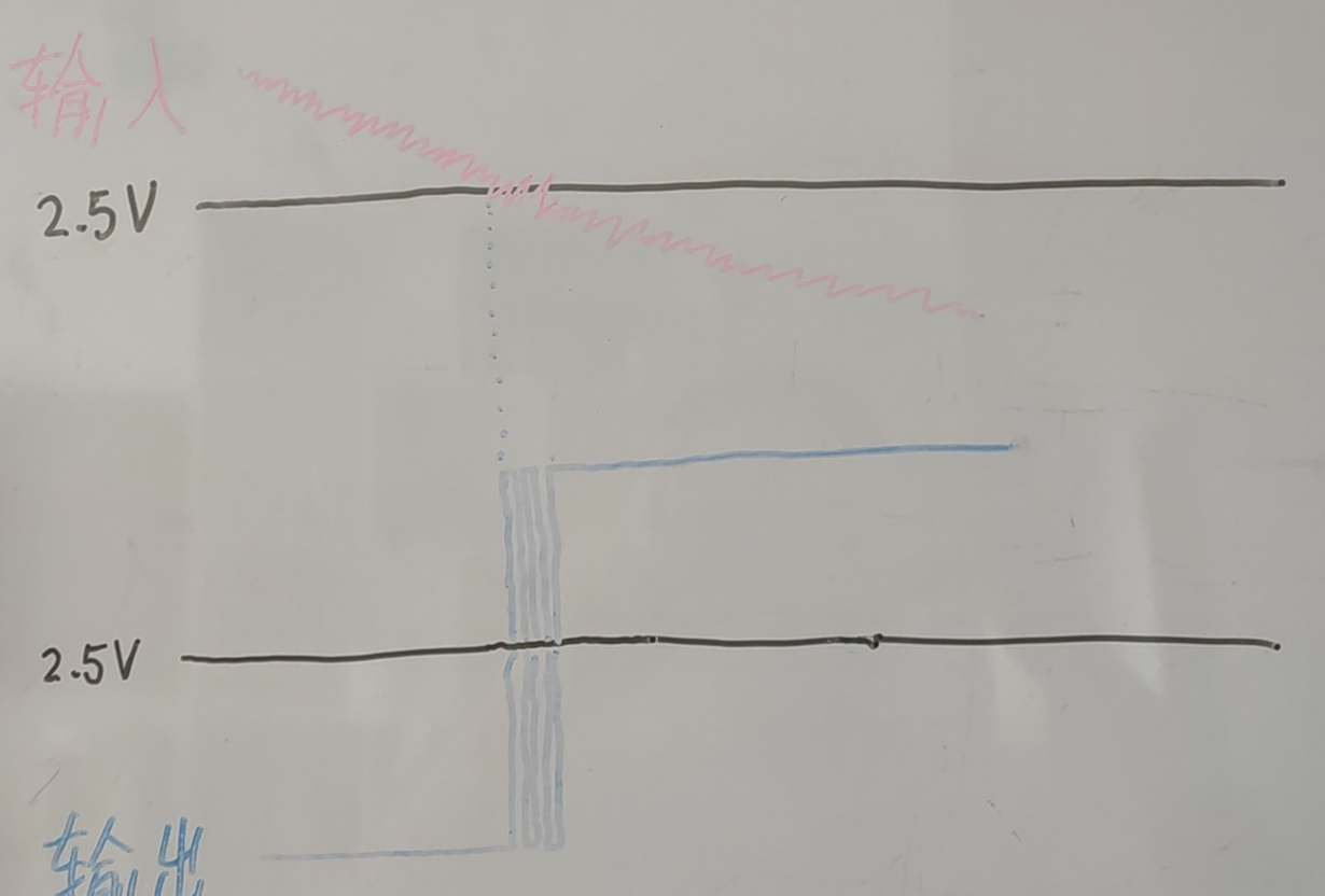 可以看到输入信号在接近参考电压 2.5 伏时,其上面的噪音会在 2.5 伏上下抖动,导致输出也跟着抖动。