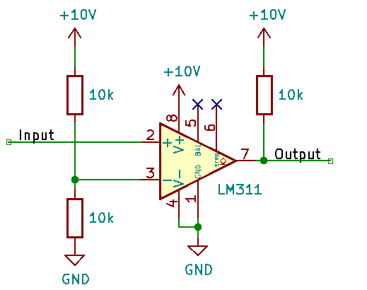 下图是一个用比较器芯片 LM311 搭建的和上面的运放比较器电路功能相同的电路: