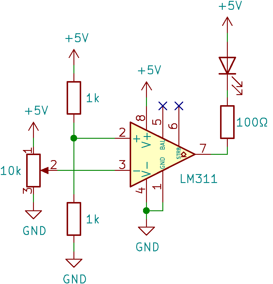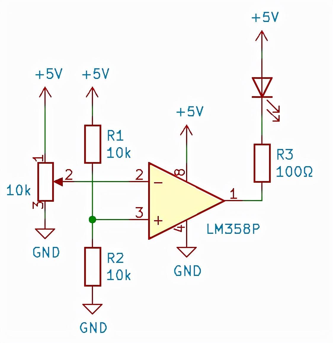 两个 10k 的电阻构成的分压器为同相引脚提供 2.5 伏的比较参考电压。可调电阻接到反相引脚,其可调电压范围为 0~5 伏: