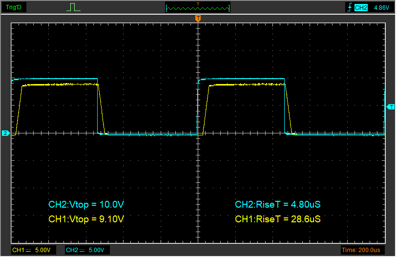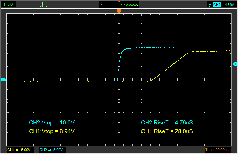我们测量波形的上升时间,即波形从10% 上升到 90% 所需的时间。 可以看到比较器以 4.76 微秒的速度快速上升。 受限于较低其压摆率,运放的上升时间达到了 28 微妙。