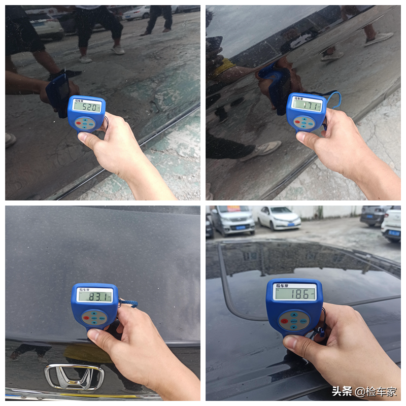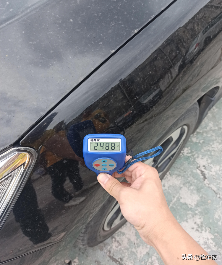 左前叶子板的漆面厚度快爆表了,得换个单位来描述,两厘米半,腻子够厚的!说明有过钣金整形,这里至少有过刮蹭,一会儿也得注意一下里面。