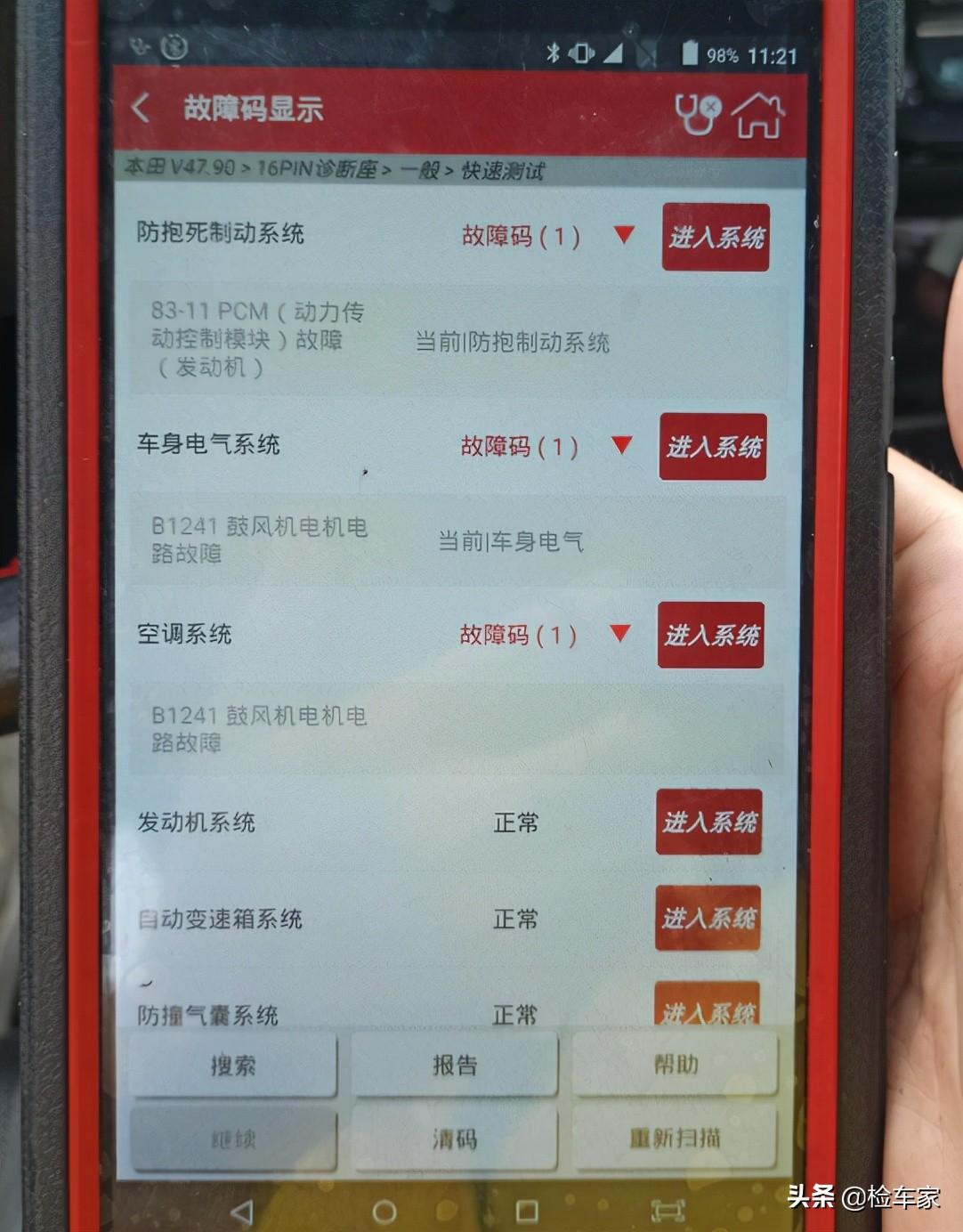 OBD电脑读取到ABS防抱死和空调系统的故障代码,ABS这个得去有条件的路面测试功能是否正常,先放一边;然后靓仔对空调鼓风机档位反复测量,终究没发现实体故障,所以建议先清除掉故障码,后期再观察。