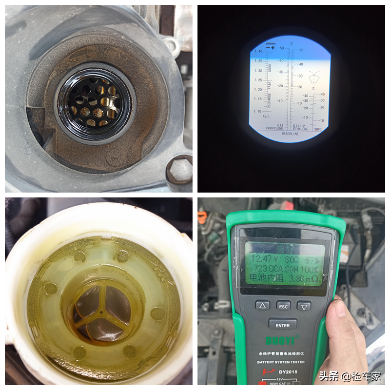 机舱最后一项,检查电瓶寿命以及全车油液,电瓶寿命良好,防冻液冰点足够,机油看起来颜色发黑,刹车油脏污。靓仔建议更换机油和刹车油,五六百块钱就能搞定。