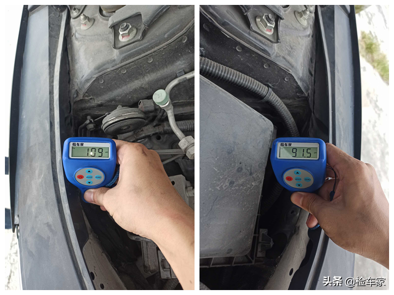 检查了里面的叶子板梁,居然是完好的,漆面厚度在正常值,表面也没有变形扭曲的情况,焊点保持了原厂状态,看来左前方是靓仔多虑了。