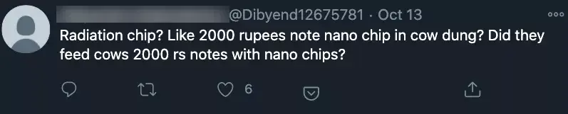 推特上也有不少印度人因此开启了嘲讽模式:“( 反 )辐射芯片 ?牛屎里富含 2000 块钱卢比价值的纳米芯片?他们拿 2000 块钱卢比和纳米芯片喂的牛 ?”