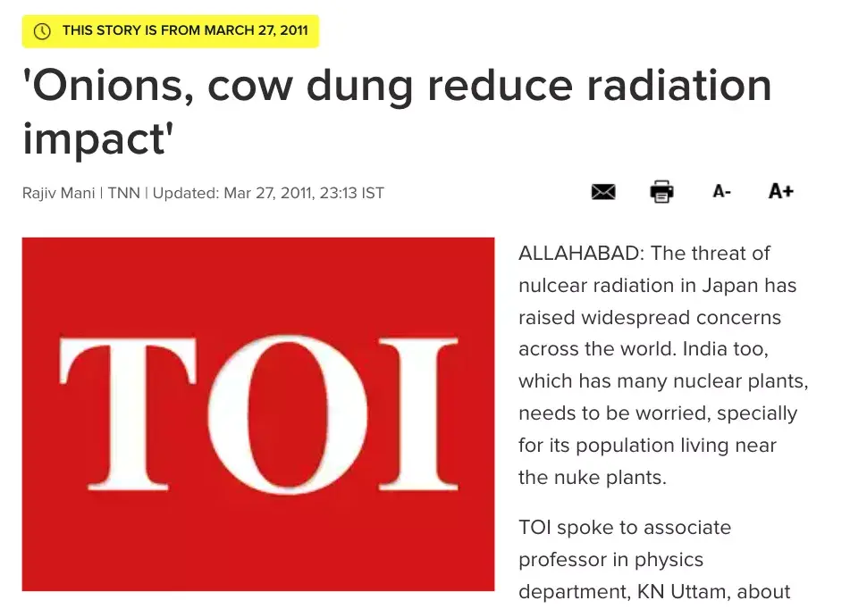 这话听着挺荒诞的,但是想不到,它还真的有理有据。。。在 9 年前,一位印度物理系的副教授声称,在洋葱的表面涂一层牛粪,牛粪就可以吸收 α 射线、 β 射线和 γ 射线。