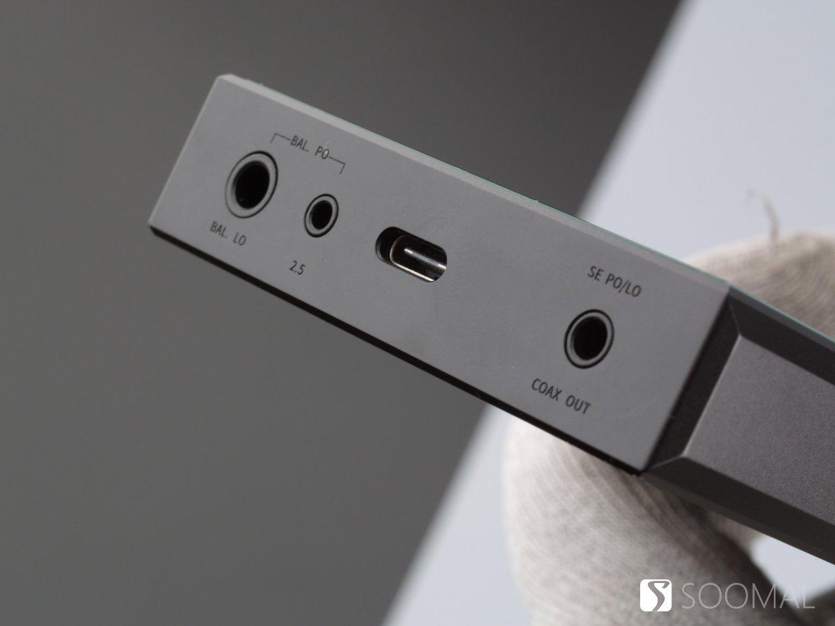 接口方面,顶部输出提供了一个4.4mm平衡口和一个单端/平衡二合一的3.5mm接口,右侧还有一个用于接驳后端设备的3.5mm线路输出接口。三个接口上方分别有指示灯来帮助判断当前的输出接口和输出方式,3.5mm和4.4mm之间有一颗GAIN状态指示灯,红色为高增益,蓝色为低增益。底部USB Type-C接口,支持充电、USB DAC、USB OTG,功能比较丰富,足够满足大部分烧友的需求。