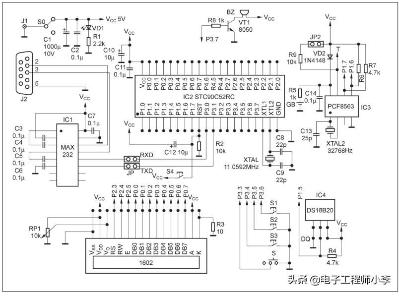 电路原理图如图11.2所示,硬件接线比较简单。字符液晶1602通过插针和排针座与电路板连接,MAX232和9孔D型串口插座J2用于STC单片机的程序下载以及和计算机通信,实现与计算机上时间的同步。IC3是实时时钟电路PCF8563,它的电源串接有二极管VD2,总电源接通时,通过它给PCF8563供电。断电过程中,后备电池GB通过R5以很小的电流(0.25μA)维持PCF8563继续工作,同时,二极管可防止BAT向其他电路供电,以免电池很快耗尽。电阻R6、R7是I2C总线的上拉电阻,单片机通过程序模拟I2C的动作,通过P1.6、P1.7读写PCF8563。C13是时钟电路的振荡电容,通过它可以微调振荡频率。JP2是用于校正的跳线块,调校时接通,配合程序使PCF8563的引脚连接10kΩ上拉电阻R9,通过编程使该引脚输出32768Hz的振荡频率,以便外接频率计调校快慢。IC4是测温芯片DS18B20,读写是通过单片机的P1.5引脚控制。电源使用的是5V/2A的开关型墙插电源,适用交流电压范围宽,发热低,也省掉了稳压集成电路,只要加一个滤波电容C1和一个旁路电容C2即可。RP1可用于液晶显示屏的对比度调节。液晶1602的数据线有8线和4线两种接法,前者要多接4根线,但程序稍微简单,速度也快一点,后者虽然接线简单,但编程比较复杂。本制作使用8线接法:液晶的数据线DB0~DB7对应接到MCU的P0.0~P0.7引脚,液晶的控制线RS、RW、E分别接到P2.3、P2.4、P2.5。控制按键S1、S2、S3互相配合用来人工校对时钟,S1用来改变校对项目,S2用来调整对应项目数据,S3用来确认新设定值。如果单独使用S3则是启动单片机的串口通信,准备接收来自计算机的时、分、秒数值,并用它设置PCF8563,使它和北京时间同步运行。开关S的作用是控制闹钟,它若断开,则闹钟功能有效;它若接地,则闹钟功能禁止,但设置的闹钟时间仍然有效。