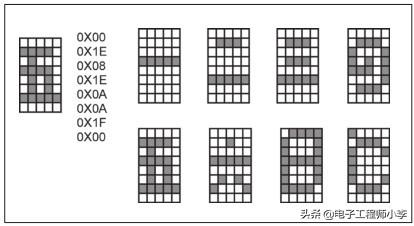 首先画出一个5×8点阵方格,在上边画出点阵字型,我们以“五”为例介绍,显示点为1,不显示点为0。从上到下,显示点可用8个十六进制编码表示,因为水平方向只有5位,故高3位以0补全,所以“五”的表示编码是:0X00,0X1E,0X08,0X1E,0X0A,0X0A,0X1F,0X00。依此类推,按照点阵图写出8个符号的十六进制编码,构成一个存放在ROM中的8行8列的二维数组。