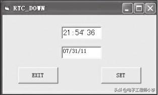 如果是人工设置PCF8563,要把它调节到与北京时间一致,这是有点难度的。电脑上的时间借助于互联网实时更新,还是很准确的。既然有串口可以从电脑下载程序,那正好利用它从电脑取得时、分、秒等时间数据来设置单片机的PCF8563,岂不方便多了?按照单片机的串口方式1,使用9600波特传输率,从电脑接收8个字节的数据仅仅80位,不到10ms就可传送完毕,因此是可行的。为此,我们可通过现成的“标准时间校准器”小软件(可到网上下载)先把电脑时间校正到标准时间,然后通过自编的小程序RTC-DOWN把当前电脑时间从串口发送到单片机就可以了。该程序的运行界面如图11.8所示,上面有两个文本框,分别显示电脑当前的时、分、秒和日、月、年,有两个按钮,EXIT是退出,SET是设置。使用前先不按S1和S2,只按下S3,液晶上左角显示R,如图11.9所示。说明已经打开了串口接收,鼠标点击SET,电脑时间就下载到PCF8563寄存器中,R消失,单片机时间和电脑时间同步完成(当然还是有差值的,但比手动调节方便许多)。