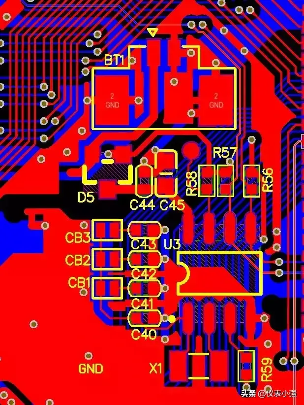 由于RTC的晶振输入电路具有很高的输入阻抗,因此它与晶振的连线犹如一个天线,很容易耦合系统其余电路的高频干扰。而干扰信号被耦合到晶振引脚导致时钟数的增加或者减少,考虑到线路板上大多数信号的频率高于32.768kHz,所以通常会发生额外的时钟脉冲计数,因此晶振应尽可能靠近OSC1和OSC2引脚放置,同时晶振、OSC1和OSC2的引脚最好布成地平面,具体PCB布线如图3所示。