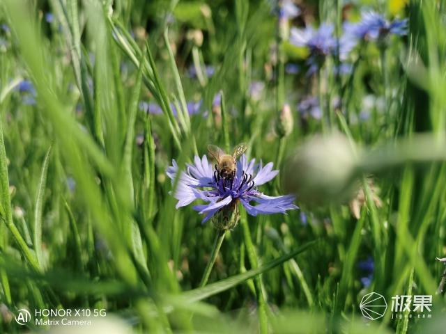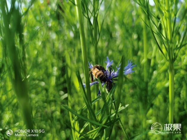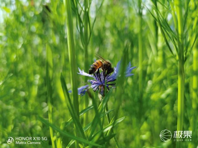 同时荣耀X10还具备疾速拍的能力,它从三个维度对相机对焦进行了优化,提升了抓拍时的响应速度,从而让我们更能轻松的抓住转瞬即逝的画面。这张“熊孩子”以及蜜蜂采蜜的照片,我都是以一个低机位拍摄的,顺光低机位拍摄我看不到手机屏幕,所以只能依赖荣耀X10的极速抓拍能力。这也正是对手机的考验。通过盲按快门,我得到了这张照片。它的成像正是靠荣耀X10的AI 4D追焦技术以及快门优先、零快门延迟技术,让我们轻松抓拍到更多生活中的瞬间。所以我们去看演唱会、体育比赛,记录车窗外的景色、孩子活动瞬间等场景,都可以轻松应对。