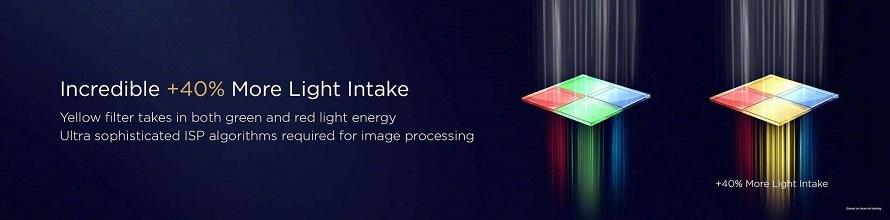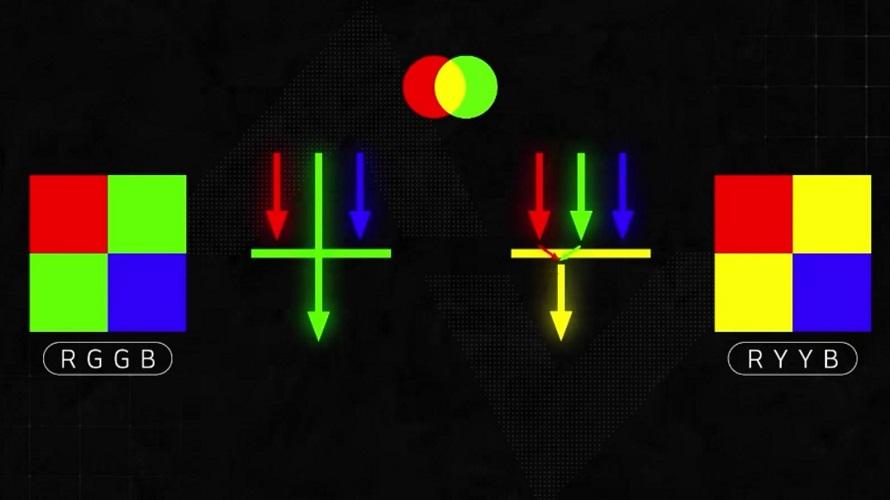 RYYB将过去RGBG中的绿像素替换为了黄色像素。这一设计的原理在于黄色的光谱刚好夹在绿色和红色之间,只要CMOS滤镜的光谱设计足够优秀,黄色像素就能同时记录红色和绿色的值,总感光量肯定是提升的。但正所谓有得必有失,RYYB在带来进光量提升的,也给色彩标定带来很大的技术挑战,稍不小心就会在最终的成像中产生较大的色彩偏差,需要强大的算法和技术力去做矫正。