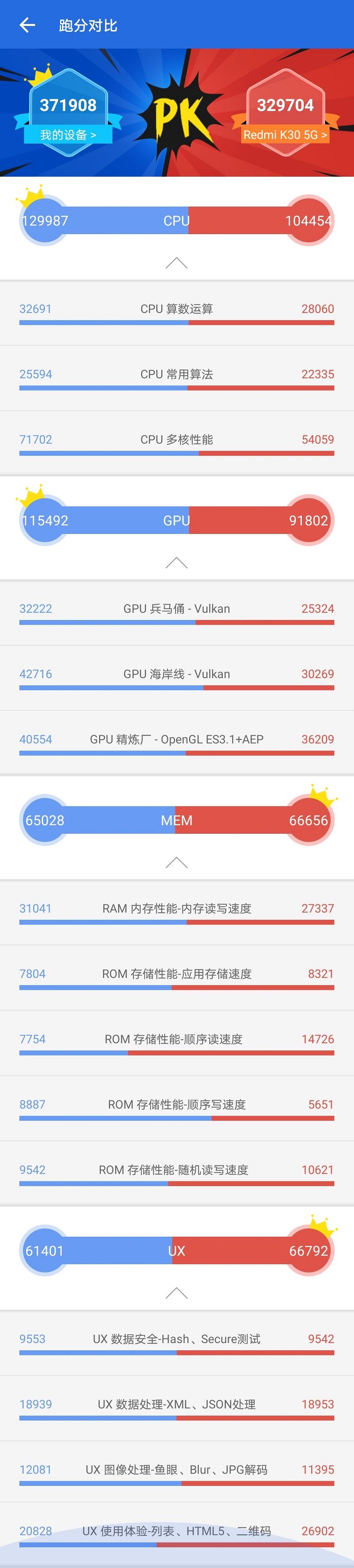 麒麟820在GPU设计上采用了全新的G57架构(实际架构等同于最高端的G77),并配置了6颗Mali-G57核心。相比前代麒麟810上的Mali-G52核心,图形性能提升高达38%,可谓十分亮眼。通过安兔兔的跑分对比,820无论是CPU还是GPU上都比同价位主流的骁龙765G要强大不少,在各种大型游戏里也都能有相当不错的游玩体验。