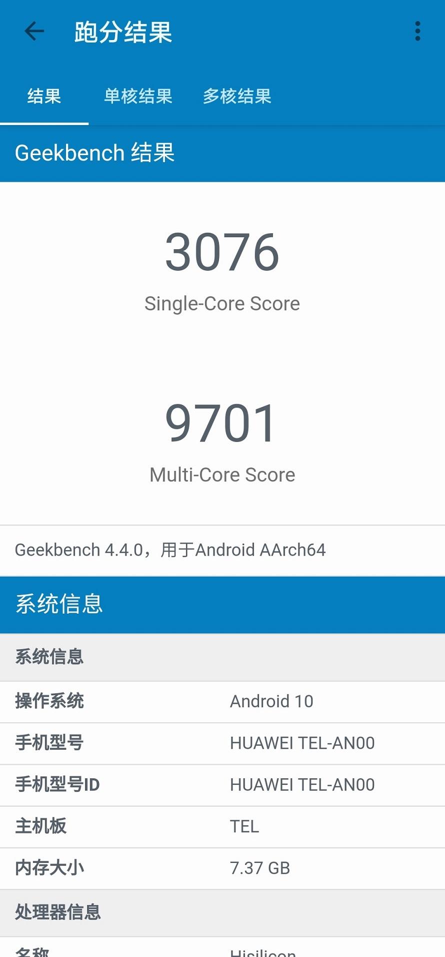 麒麟处理器一直是华为手机的一大卖点。从早期K3V2孱弱的性能、爆炸的功耗被消费者激烈吐槽,到去年的810在中端市场收获一片美誉,这些年华为也是一步一个脚印,非常不容易。这一次的麒麟820依旧采用了业界先进的7nm制程工艺。在CPU设计上,麒麟820共有8个核心,分别是一个最高主频2.36GHz的Cortex-A76大核心,3个最高主频2.22GHz的Cortex-A76中等核心,以及4个最高1.84GHz的Cortex-A55小核心的设计。也就是一个大核、两个中核、四个小核,1+3+4的形式,这样设计的好处是在能够保证性能的前提下,再进一步的降低功耗。实际效果确实非常显著,在GeekBench 4的CPU跑分也获得了远超同类型机型的表现。