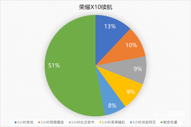 续航方面,荣耀X10使用了一块4300mAh的大容量电池以及支持22.5W的快充。我做了5小时连续测试,经过测试,手机剩余电量51%,在重度使用情况下,能够轻松满足用户一天的使用需求。在充电速度方面,经过测试,1小时左右即可充满,充电速度很快。所以可以说是当下出差党的福音。