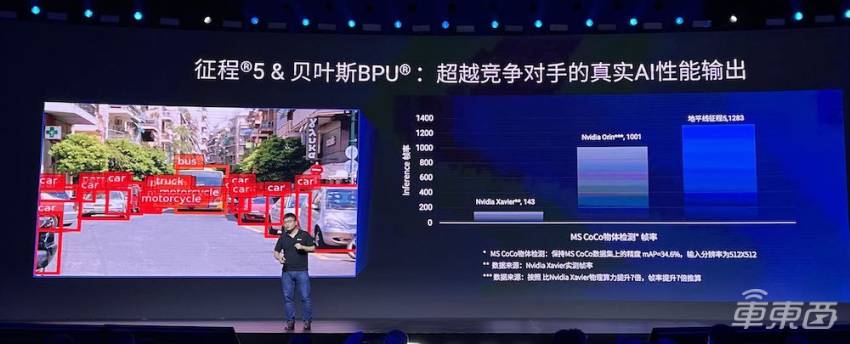 在MS CoCo物体检测测试中,输入512*512分辨率的图像,保证mAP精度达到34.6%的前提下,英伟达Xavier的处理速度是143FPS。由此推算,性能7倍于Xavier的英伟达Orin芯片帧率为1001FPS。而地平线征程5在这一测试中取得的成绩是1283FPS,并且拥有更低的功耗。