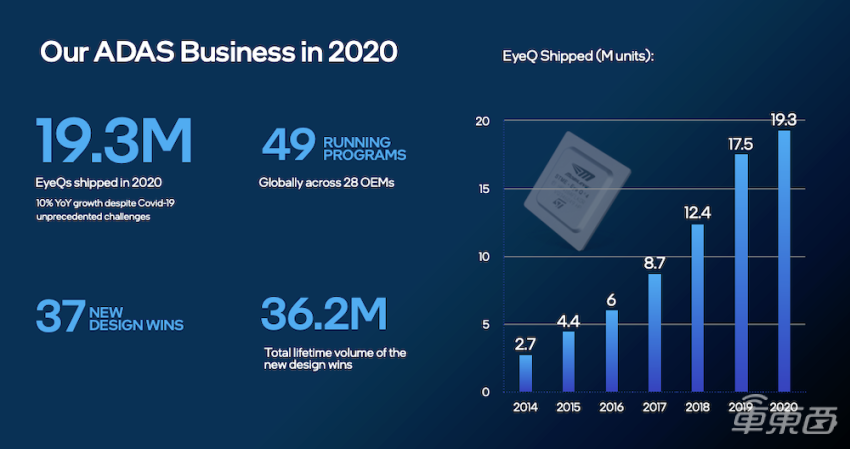 根据全球ADAS头部企业Mobileye年初发布的报告,2020年,Mobileye EyeQ系列芯片的出货量达到1930万片,覆盖了全球28家OEM厂商,共有49个项目,这一体量非常巨大。