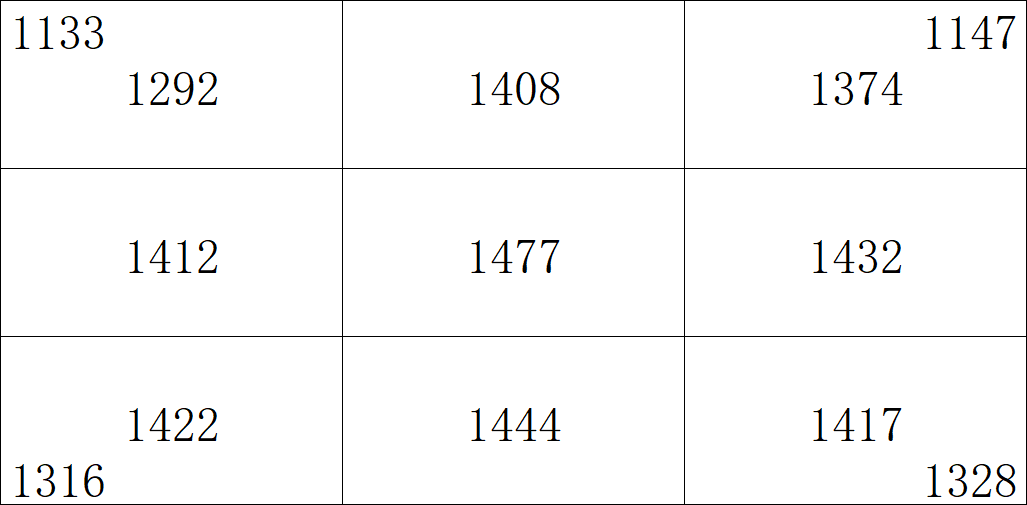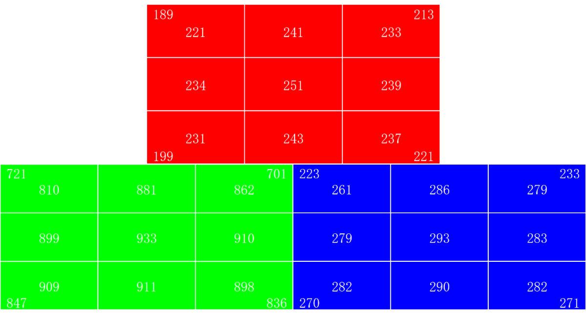 与ANSI流明以及ISO流明的9点测量法不同,极米CCB流明采用的是13点测量,就是在靠近4个角的位置又加入了4个测试点,同时从单纯的白场测试转为红绿蓝三色测试,下面就是我绘制的红色测试图。