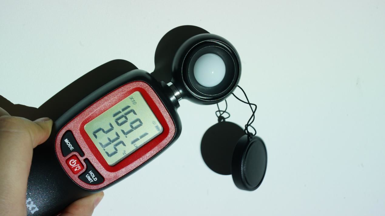 测试使用的是照度计,投影尺寸调整成60英寸(任意尺寸都可以,60英寸的面积约为1㎡,测出的结果不用计算就接近于实际值,比较直观)