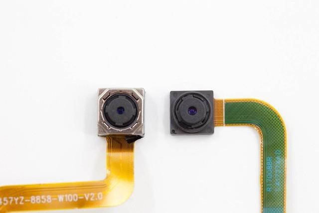 左侧的是800万像素的后置摄像头,体积更大是因为拥有AF自动对焦模组;右侧则是前置的1300万像素三星摄像头,可见镜头通光孔径更大,官方宣传为F2.0光圈、并且拥有82.8°超广视角。