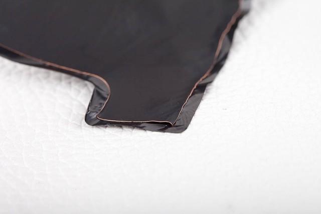 该散热片目测拥有三层结构,除了底层胶合层外,中间可见铜质金属层,是主要的导热材质;铜质金属上还涂有黑色石墨涂层,加大散热面积。