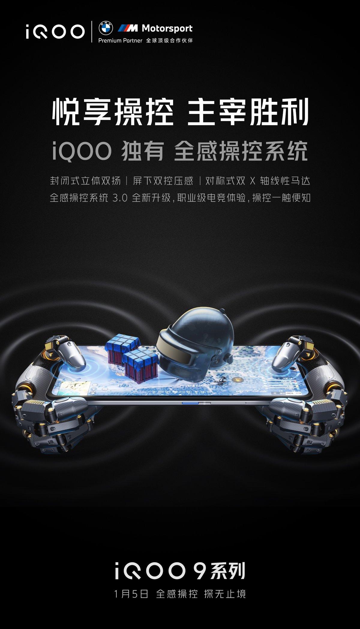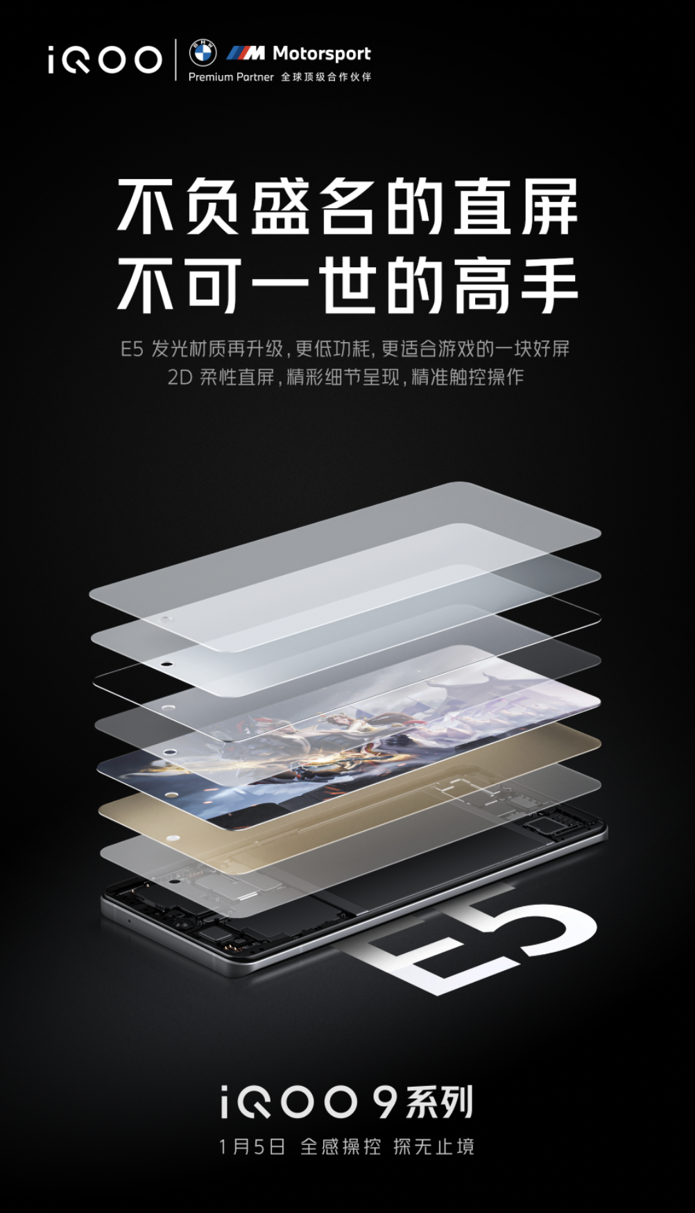 2021年12月28日,@iQOO手机 官方微博宣布新品iQOO 9将采用2D柔性材质的E5超视网膜屏,配备全新独立显示芯片Pro,并搭载能够带来职业级操控体验的全感操作系统3.0,为广大用户开启全感操控的未来之旅。