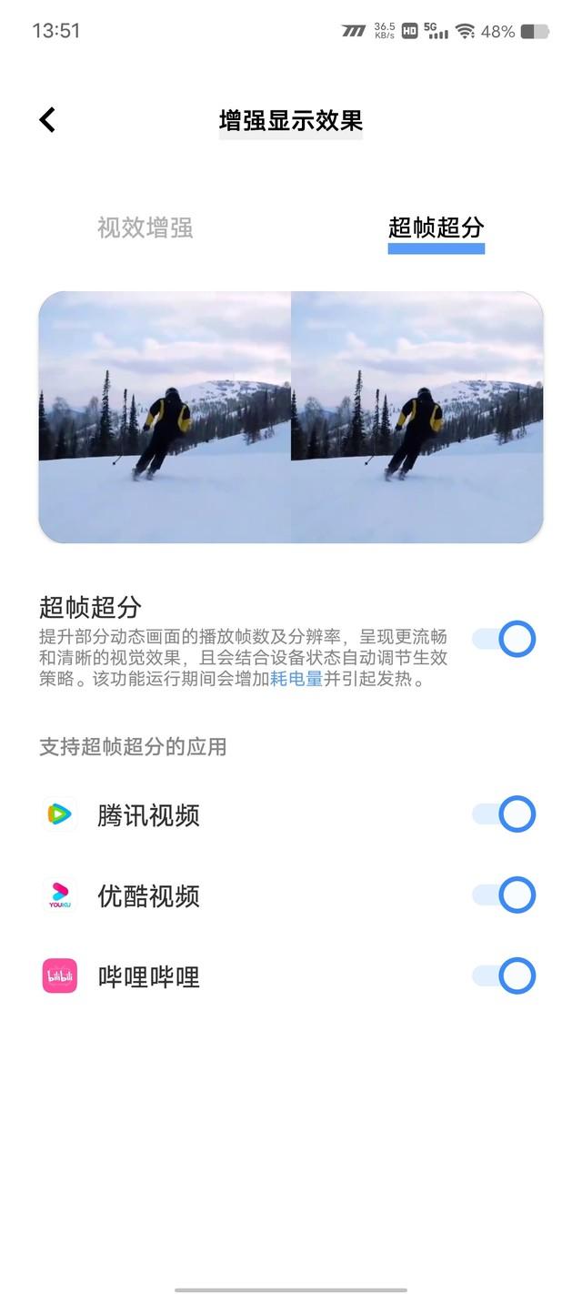 值得注意的是,基于这颗iQOO超算独显芯片,iQOO 11S还带来了视频超分超帧技术,为主流的30帧普清视频内容源带来清晰流畅的视觉体验,目前已覆盖了哔哩哔哩、优酷、腾讯视频等主流平台的绝大多数视频内容。