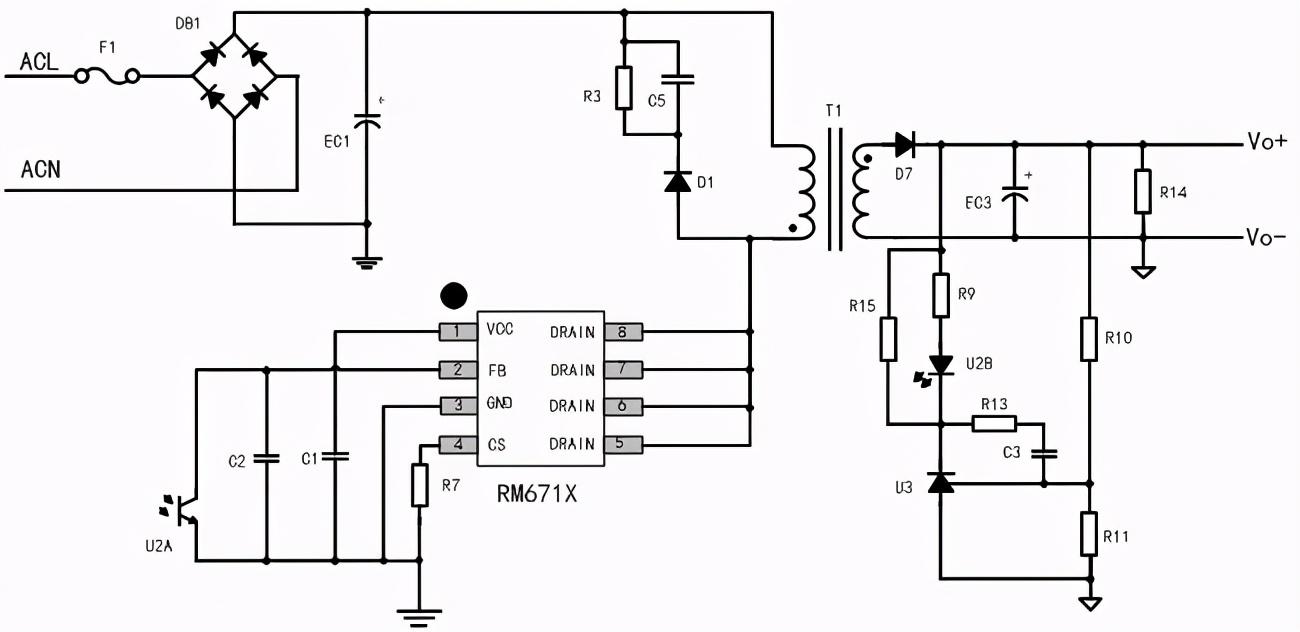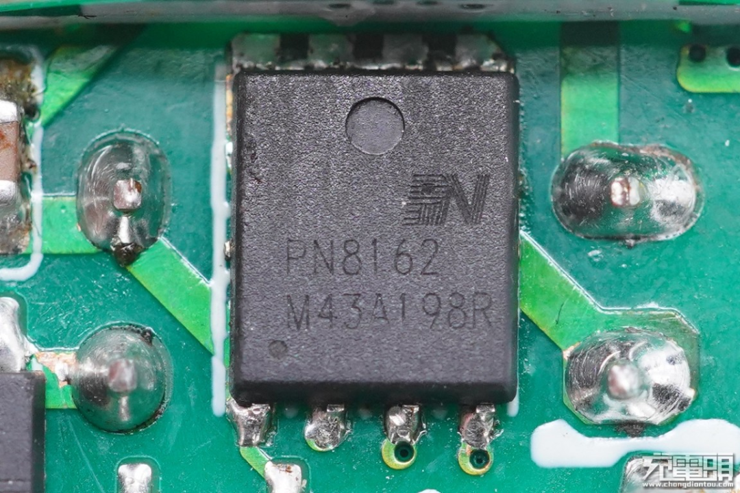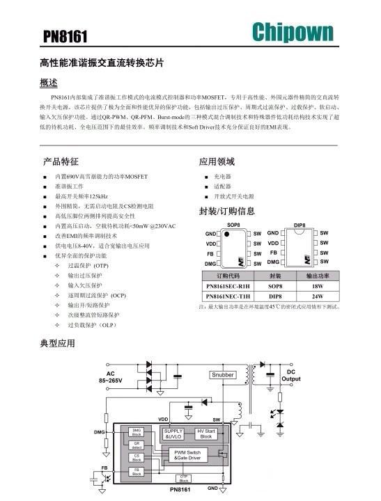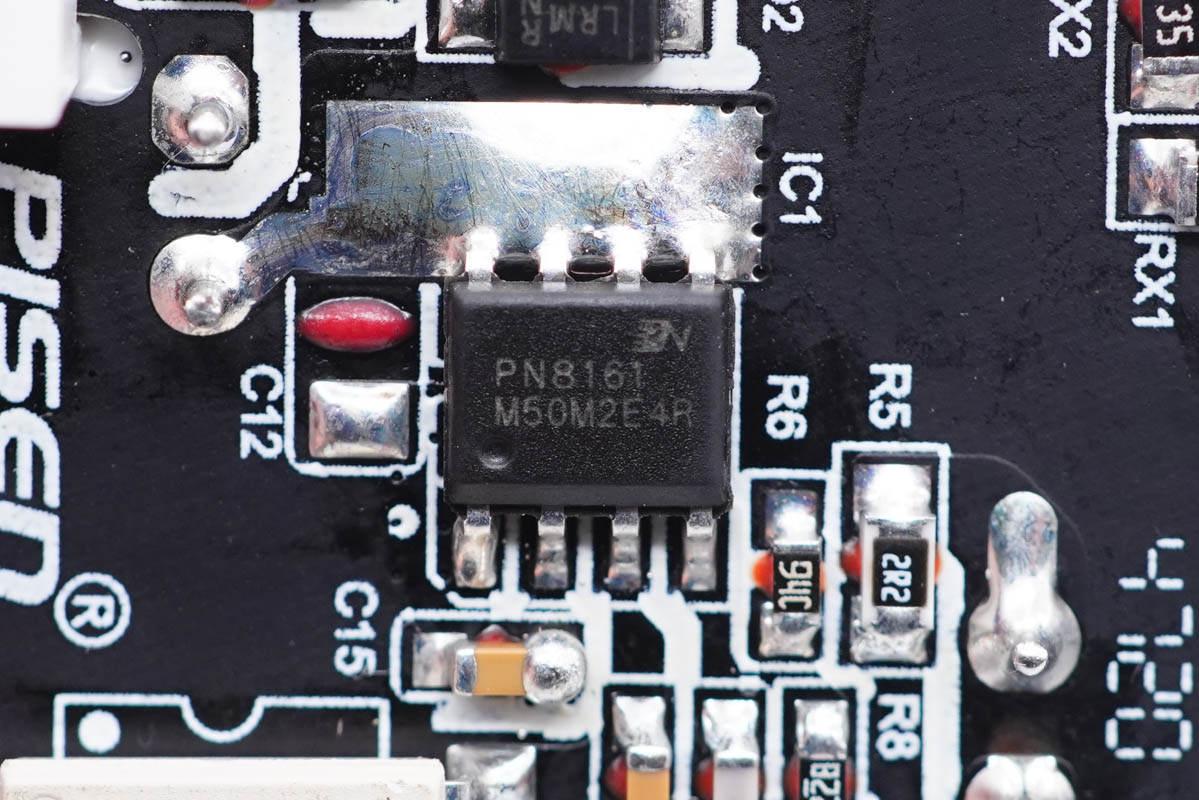 PWM主控芯片PN8161来自Chipown芯朋微。该芯片内部集成了准谐振工作的电流模式控制器和功率MOSFET,专用于高性能、外围元器件精简的交直流转换开关电源。该芯片提供了极为全面和性能优异的智能化保护功能,包括输出过压保护、逐周期过流保护、过载保护、软启动功能。