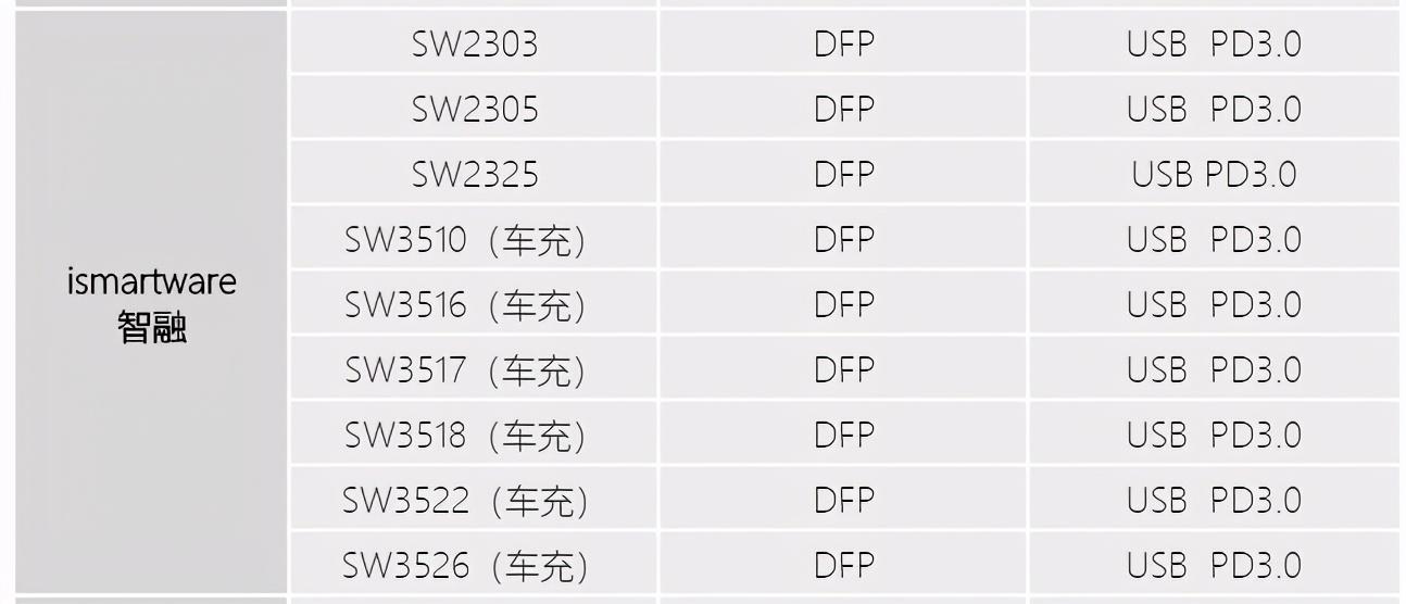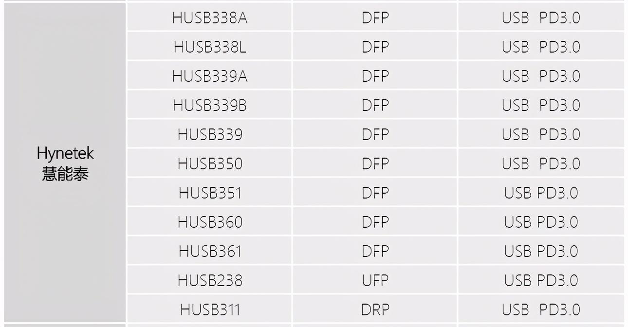 目前慧能泰已经推出了PD Source协议芯片HUSB338A、HUSB338L、HUSB339A、HUSB339B、HUSB339、HUSB350、HUSB351、HUSB360;PD Sink协议芯片HUSB238;PD PHY协议芯片HUSB311;eMarker芯片HUSB330、HUSB331、HUSB332、HUSB332A;负载开关芯片:HUSB304、HUSB305。