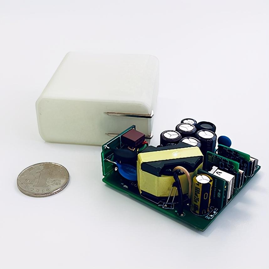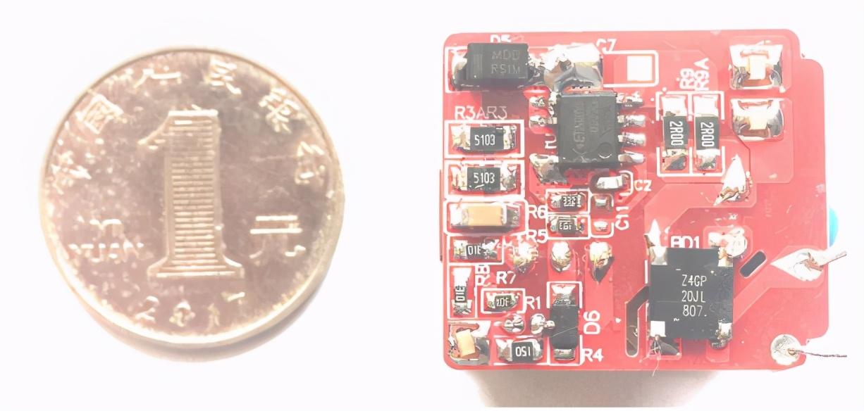 针对20W-27W市场,钰泰推出了ETA8056/8058两款,集成两款低阻抗的高压功率管IC。基于该芯片开发的0W方案PCB实测尺寸:25mm*23mm*22mm,仅硬币大小。