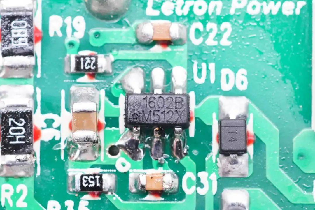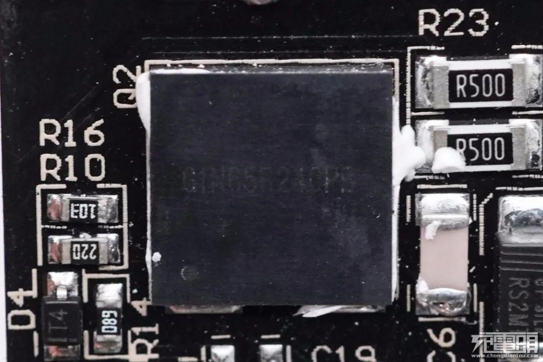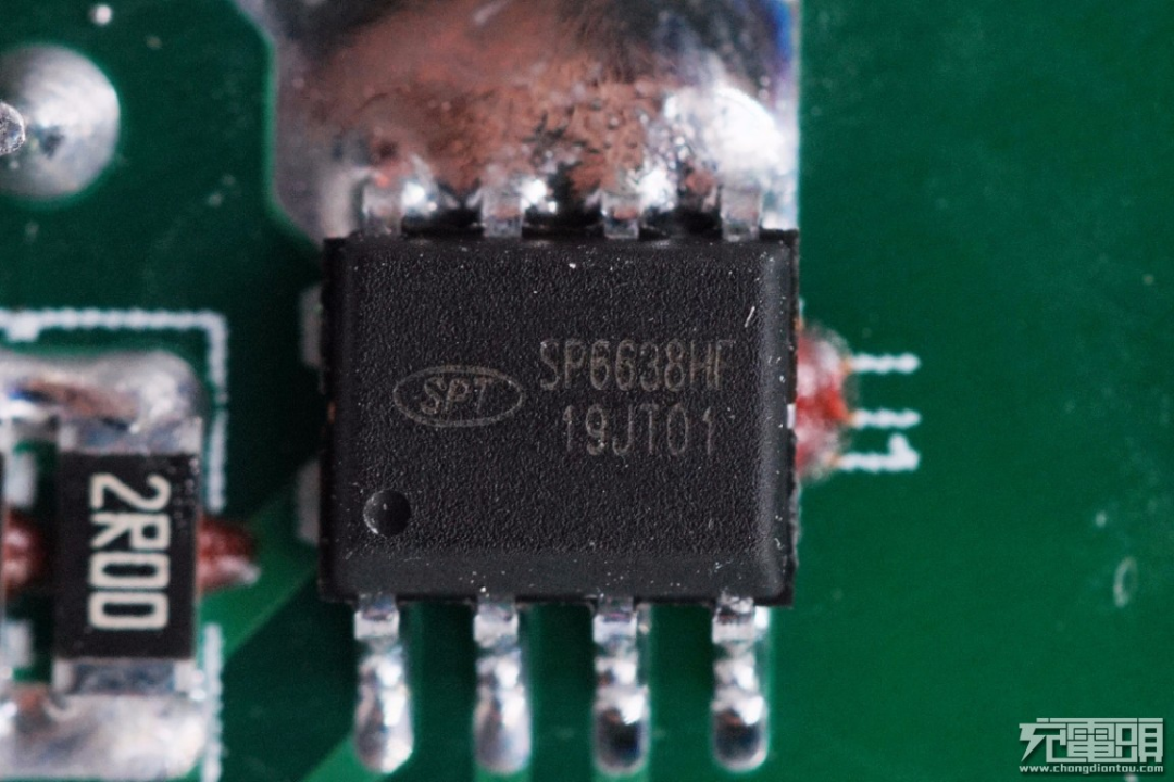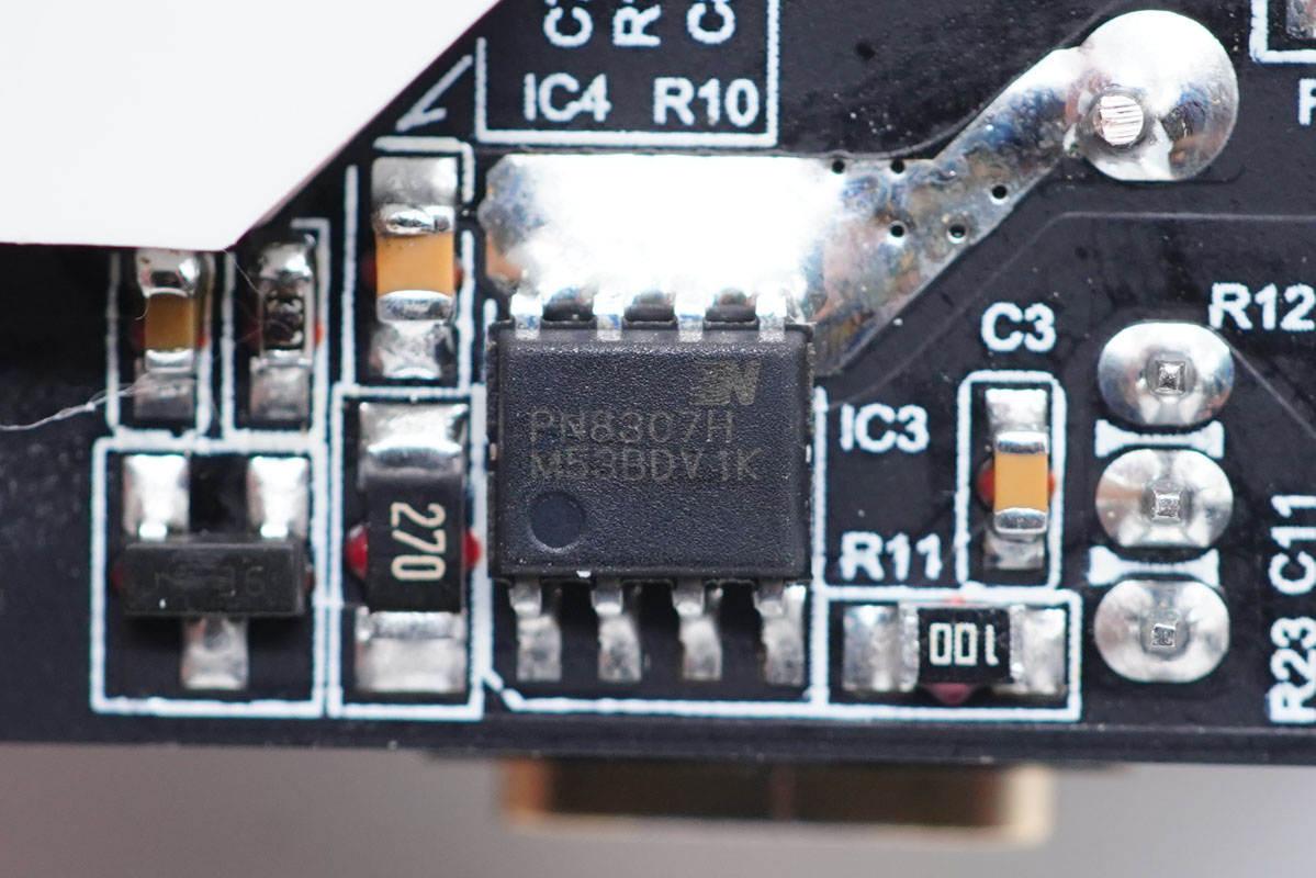 和PWM主控芯片搭配的是芯朋微PN8307H次级同步整流芯片。PN8307H内置同步整流控制器及高雪崩能力功率MOSFET,用于在高性能AC/DC反激系统中替代次级整流肖特基二极管,导通压降极低的功率MOSFET可以提高电流输出能力,降低温升,提升转换效率,使得系统效率可以满足6级能效的标准,并留有足够的裕量。