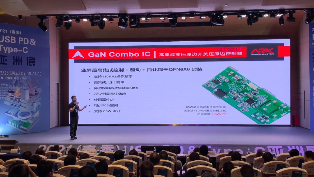 针对氮化镓快充市场,艾科微「2021(春季)USB PD&Type-C亚洲展」上发布了一款高集成高压原边控制芯片,其集成控制器、驱动器和氮化镓功率管,外围器件少设计简单,相对于传统方案设计而言,可减少50%空间。