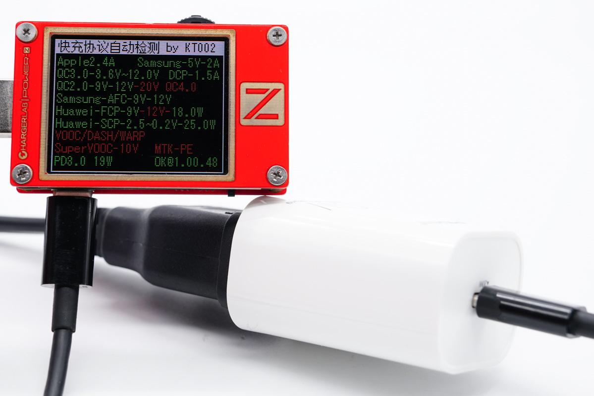 使用ChargerLAB POWER-Z KT002检测USB-C口的输出协议,显示支持Apple 2.4A、Samsung 5V2A、DCP协议,以及QC2.0/3.0、AFC、FCP、SCP、PD3.0快充协议。
