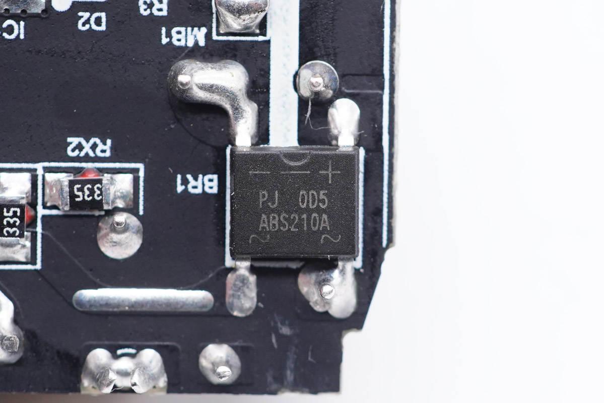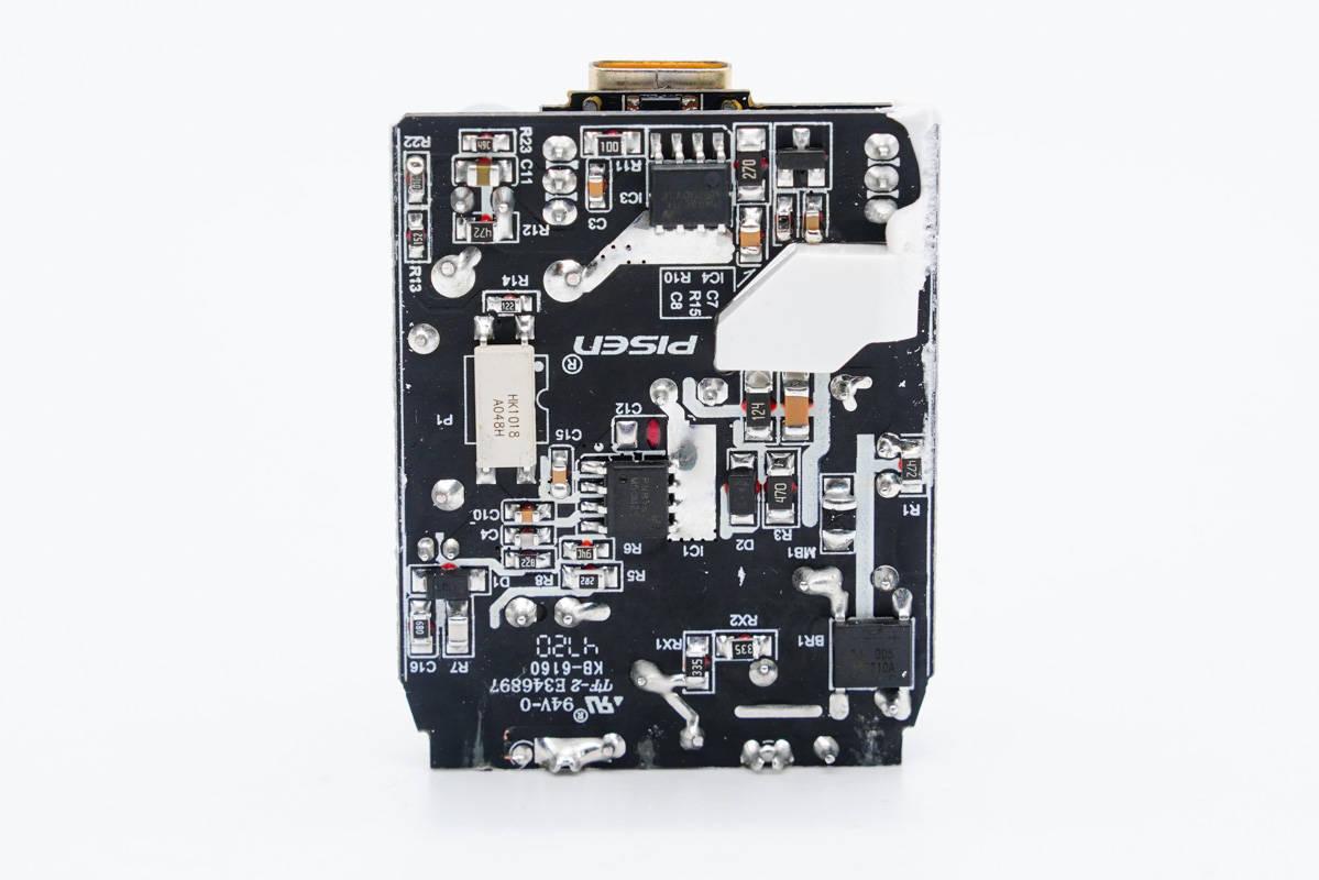 PCB板背面一览,设有整流桥、主控芯片、白色光耦和次级同步整流芯片。