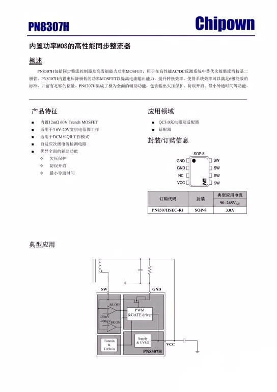 Chipown芯朋微PN8307H内置12mΩ60V耐压同步整流管,适用3.6V-20V常用适配器输出,适用于QC3.0适配器及其他固定电压输出的适配器。该芯片还集成了极为全面的辅助功能,包含输出欠压保护、防误开启、最小导通时间等功能,同时外围元件非常精简。