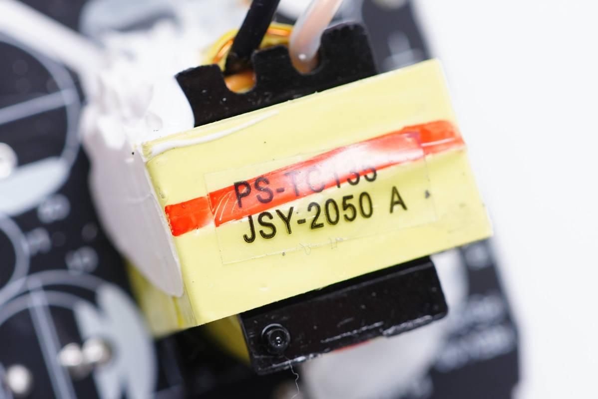 PCB板正面一览,变压器及左侧电容打胶加固,初次级之间设有隔离板。