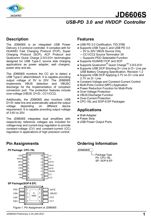 USB PD协议芯片采用天德钰JD6606S,该芯片通过了USB PD 3.0认证,TID:3768。这是一颗高性能和高兼容性的快充协议芯片,采用CPC-16L封装,支持USB PD3.0快充之外,还包括支持QC3+、QC3.0、QC2.0、AFC、FCP、SCP以及APPLE 2.4A等主流的充电协议。