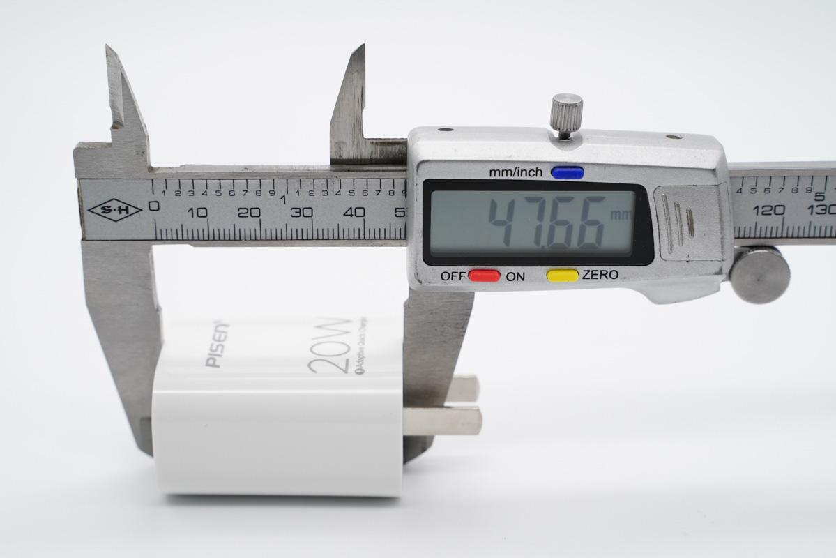 使用游标卡尺实测充电器机身长度为47.66mm。